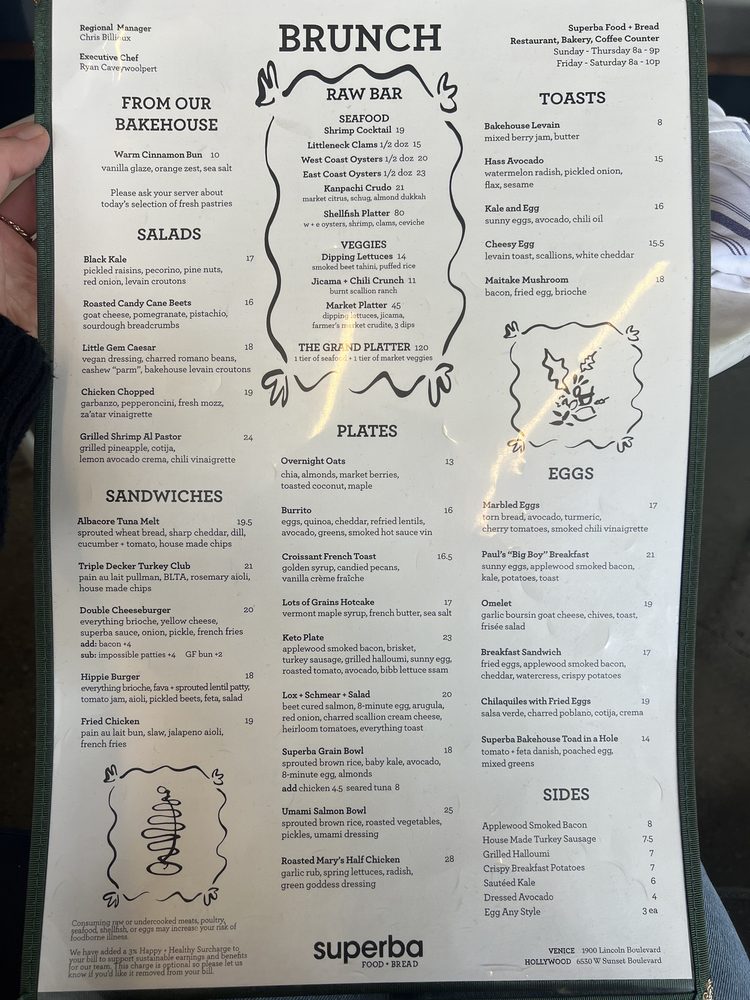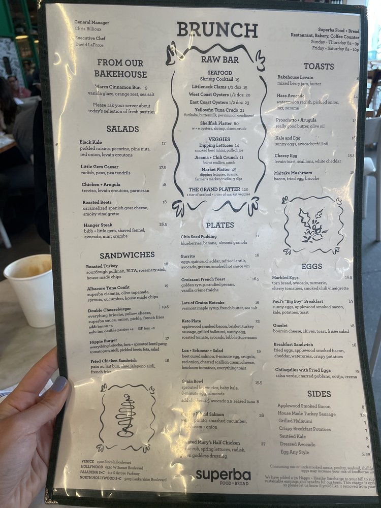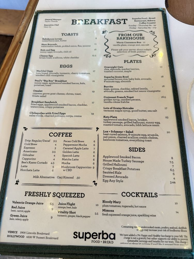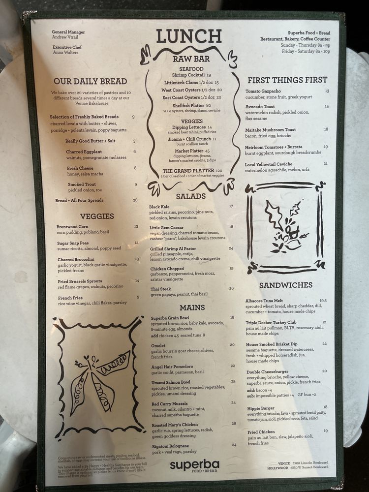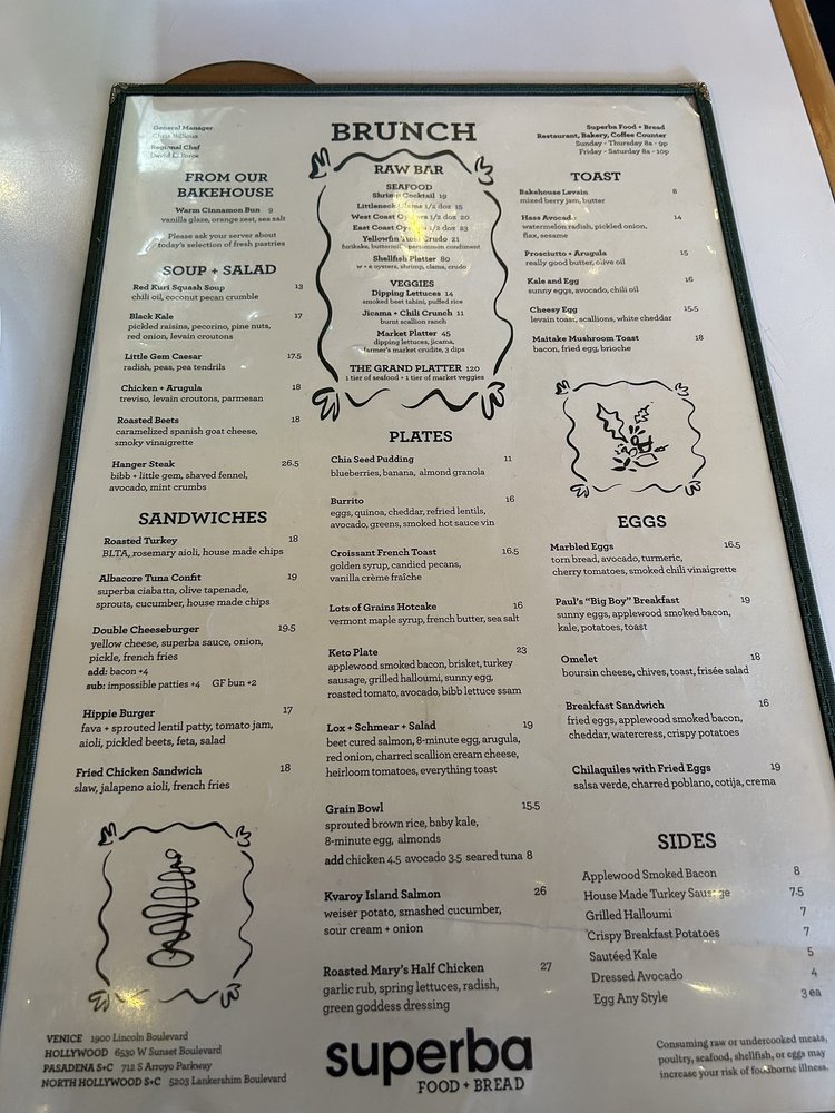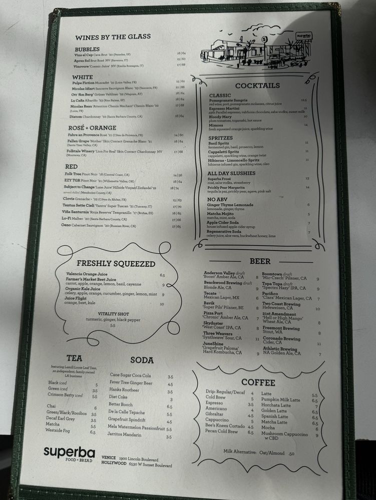 Introducing the menu at Superba Food + Bread, a trendy and classy New American bakery in Venice, CA. This establishment offers a variety of gluten-free, vegan, and vegetarian options, making it a great choice for those with dietary restrictions. From breakfast to lunch, Superba Food + Bread provides a wide selection of delicious dishes that cater to all tastes. With options for outdoor seating and dog-friendly accommodations, this restaurant is perfect for both solo diners and groups. The menu features items made with sustainable practices, like compostable containers and plastic-free packaging, showcasing their commitment to the environment. Don't miss out on trying their beer and wine offerings while enjoying the laid-back atmosphere. Make sure to stop by Superba Food + Bread for a memorable dining experience.